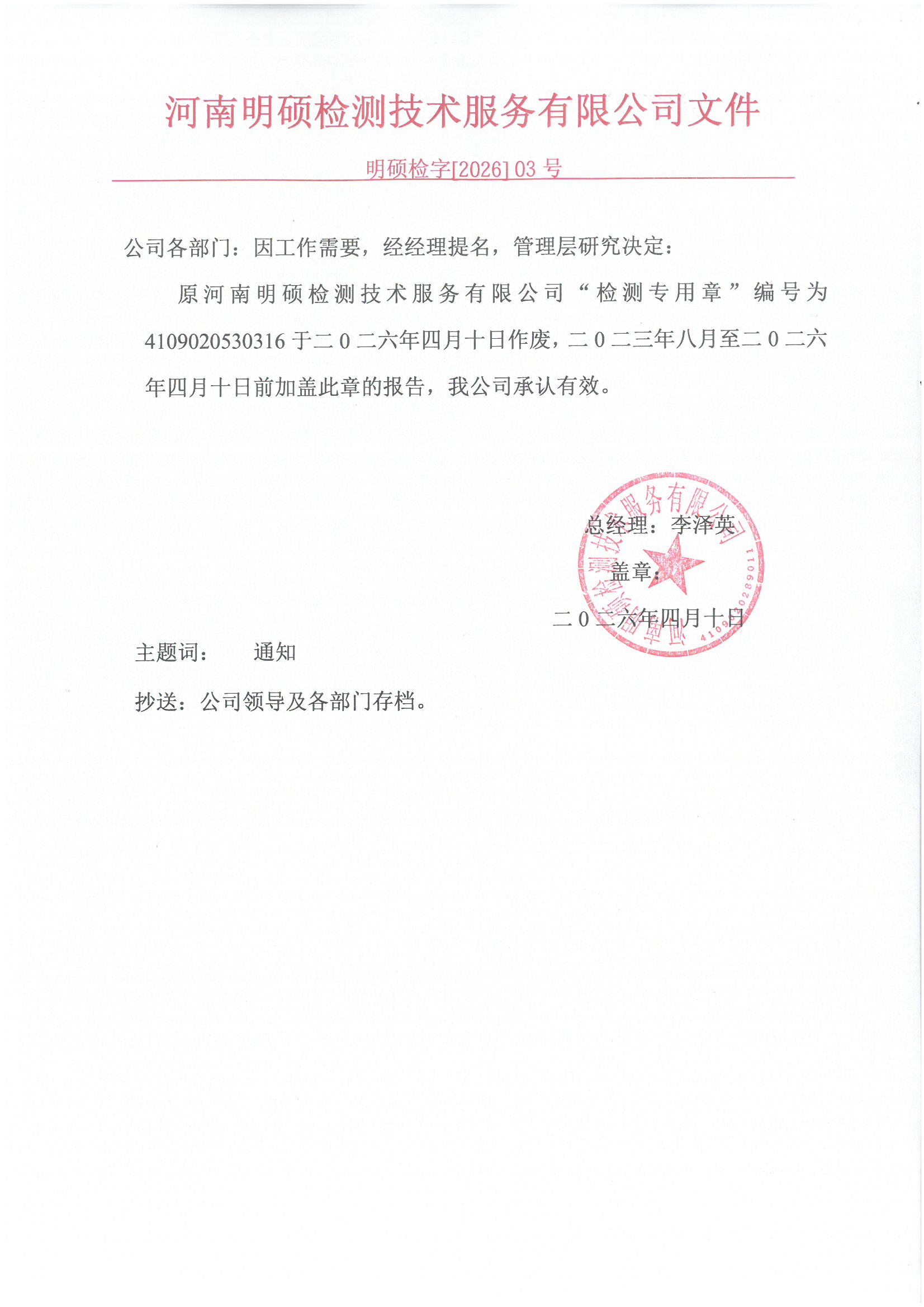 我公司于2026年4月10日起,启用“检验检测专用章”印章,上述印章均已依法备案。原“检测专用章”印章同时作废、停用。