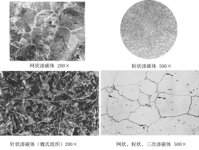 特征:渗碳体不易受硝酸酒精溶液的腐蚀,在显微镜下呈白亮色,但受碱性苦味酸钠的腐蚀,在显微镜下呈黑色。渗碳体的显微组织形态很多,在钢和铸铁中与其他相共存时呈片状、粒状、网状或板状。